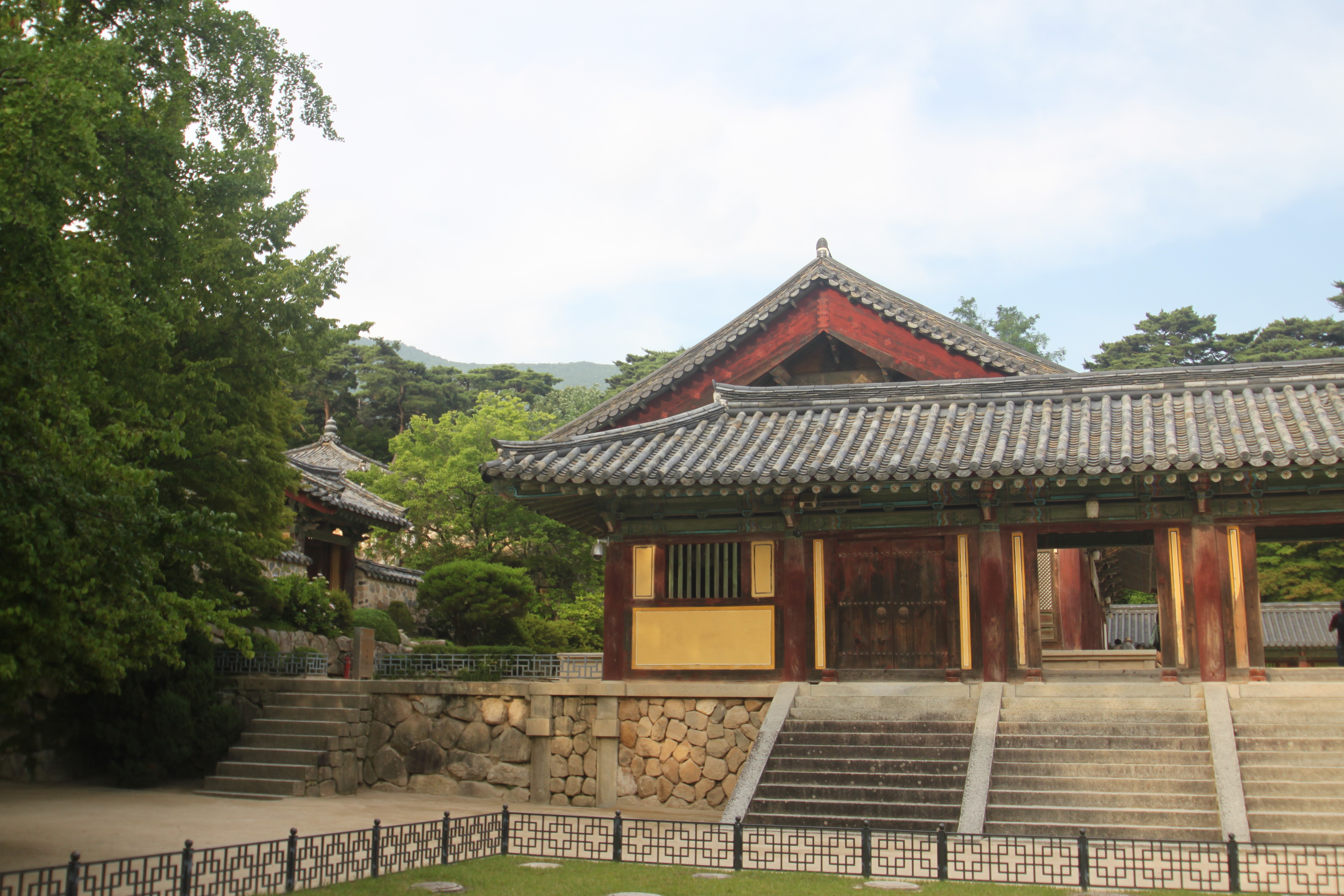 Though we visited two ancient tombs in the morning, the most significant thing for me was the visit to the Seokguram Grotto which lies inside Bulguk-sa-Temple on Mount Tohamsan. Said to have been built by Kim Daeseong in 751, it was virtually unknown for many years. It was discovered in the early 20th century when the Japanese occupying government ordered it restored. After World War II the site was neglected until a restoration project in the 1960s. It is a granite sanctualy with a Buddha statue seated in the main chamber. The statue is of Bodhisattva and his disciples and is now encased behind glass because of humidity problems. The temple is located high on the mountain and the statue faces the East Sea in order to protect Korea. So standing up there looking out on the East Sea, our professor pointed out that this site was the end of the Silk Road. It did not end in China, or in Japan even, but in Korea. Interesting.