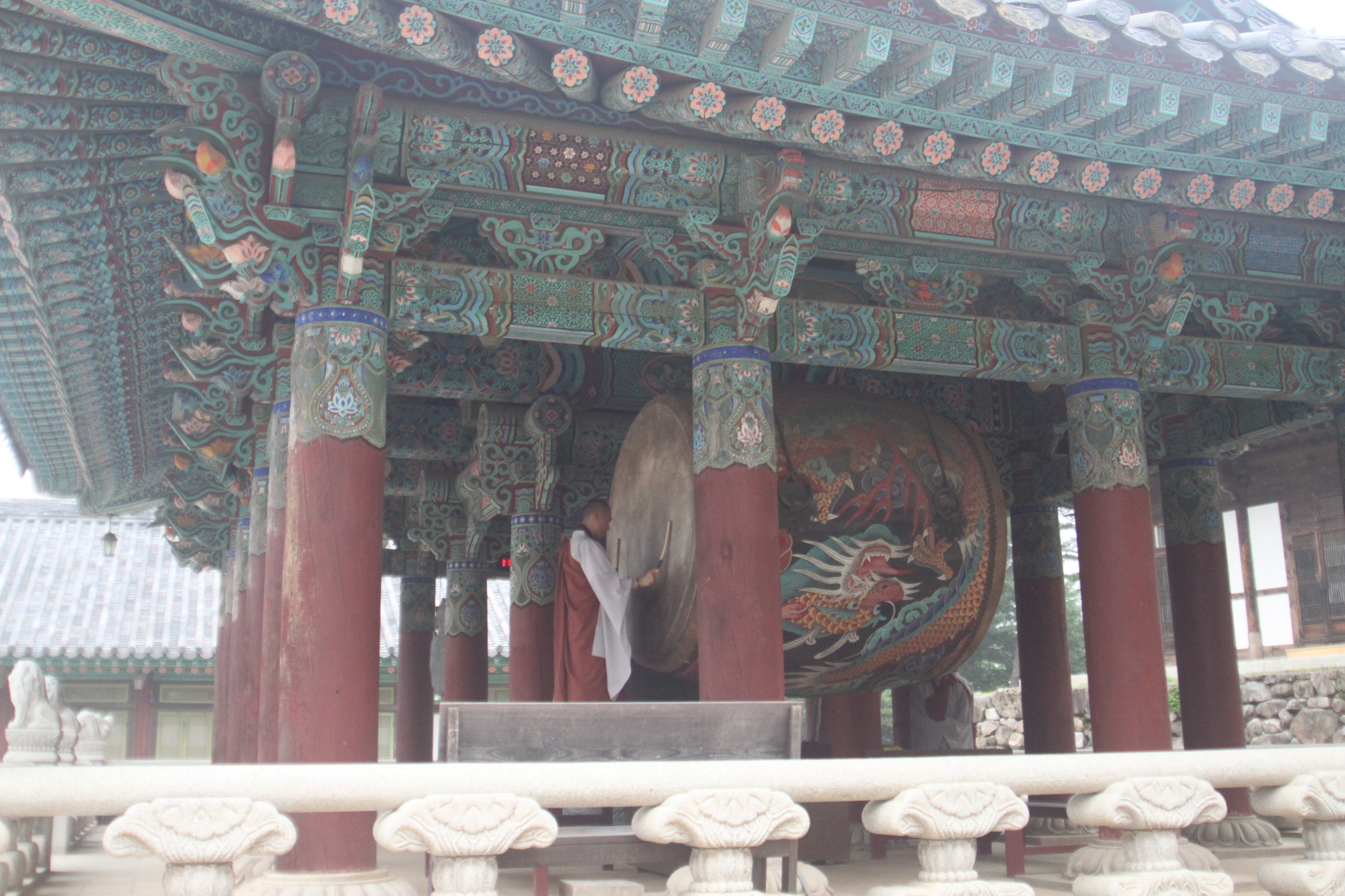 Our final day of the field trip involved a trip to a Buddhist Temple. The Hae-In Temple is by far my favorite one yet. Nestled throughout a mountain, one gets a true sense of mysticism as one walks up through the forest and then comes upon this beautiful complex. The name “hae-in” originally comes from the expression Hae-in-sam-mae which means the truly enlightened world of Buddha and the naturally undefiled mind. The temple is most famous for the Tripitaka Koreana; woodblocks that contain the entire teachings of Buddha. As we walked through the temple, the clouds slowly rolled in over the mountain and we were able to watch the monks play the drums for twenty minutes. With the weather and the music, I was truly in a state of calm.