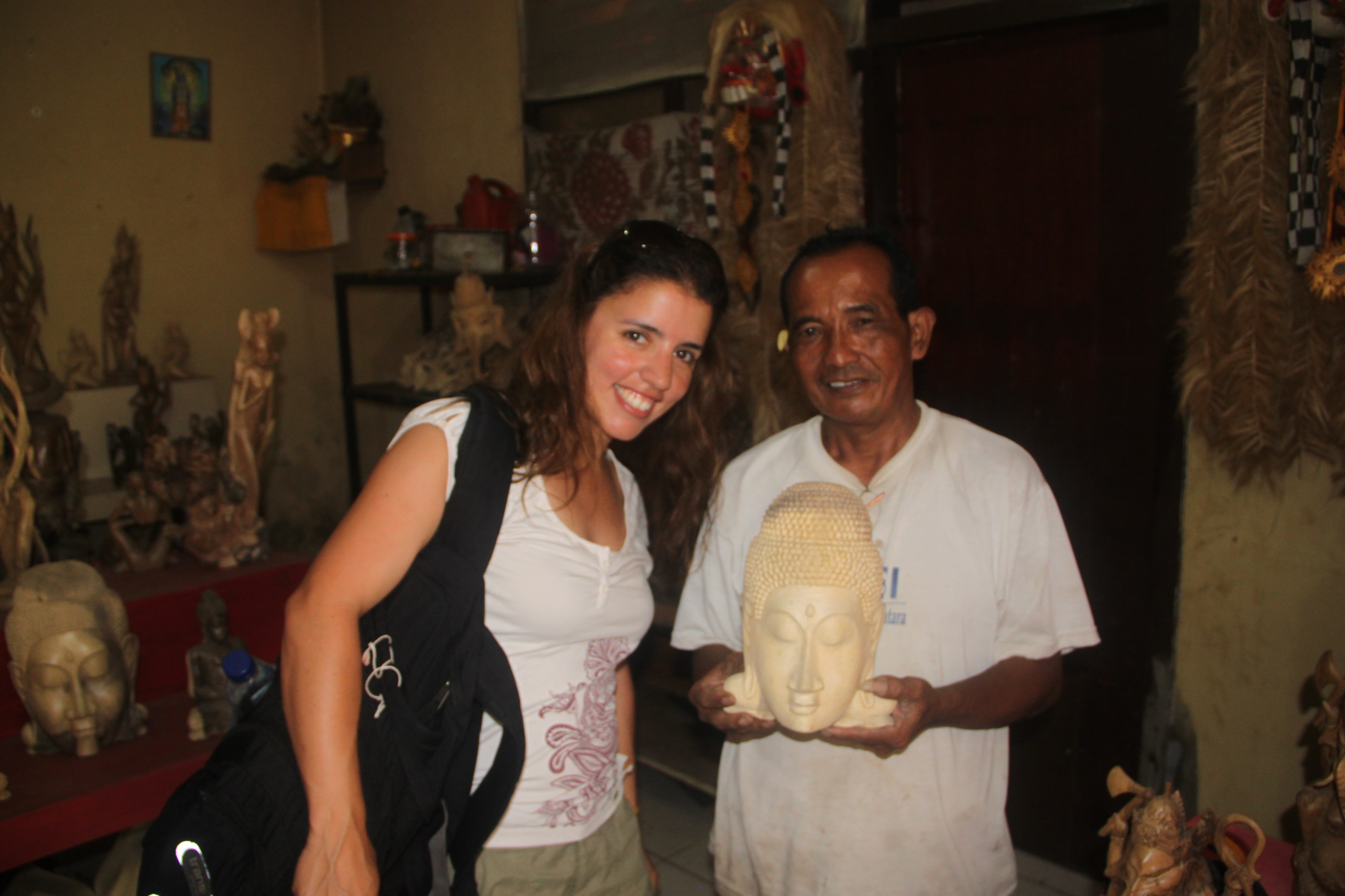 After our visit to the Monkey forest, we ventured out of Ubud to the local village of Mas, known for woodcarvings and mask making. For whatever reason, throughout my travels I have developed a fascination with masks and musical instruments; not the easiest of souvenirs to lug home with you. Needless to say, I was super excited to visit this little town and go into some of the workshops of the mask makers. When the driver dropped us off on the main street, I was a little nervous at first that this was a mistake, but sure enough as we walked along, we came across many wooden signs directing us into stores and workshops of local woodcarvers. The first shop we came across was run by a little woman named Sura Nadi, whose family’s workshop lied just behind her store. Here, I bought a really cheap mask of Barong; the spirit to ward off evil spirits in Balinese folklore. We looked around and promised the lady we’d come back, because Michelle had her eye on a wood carved statue of Buddha. We walked around some more when I found a man’s workshop full of masks. There were so many and they were so beautiful and frightening and weird and spectacular, I couldn’t make up my mind. He then took us back through his workshop and family compound into a room where he paints the masks and I found the perfect, hand carved, custom painted Barong Mask.