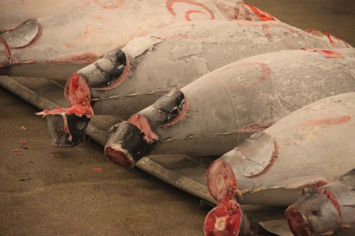 Slowly rising out of bed, all of us met in the lobby at 3:30am to head out to the famous Tsukiji Fish Market to watch the live auction of Tuna; an experience not to be missed when visiting Tokyo. After waiting in a non-descript room for almost two hours, (they only let in the first 120 people so you have to arrive early), we were directed into the market to watch the inspection and auctioning of the fish. Very cool!