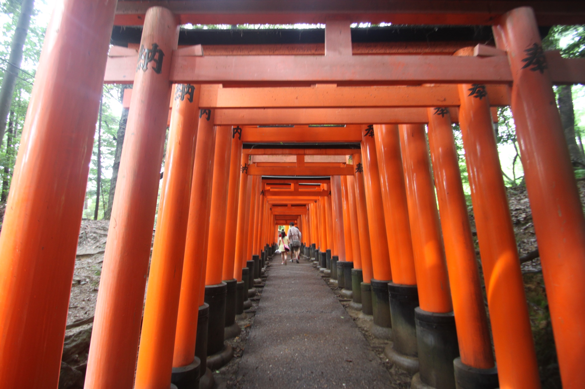 This Shinto shrine was founded in 711, and holds more than 10,000 red Torii gates. Originally dedicated to the gods of rice and sake, the shrine is now associated with prosperity in business. There is a paved pathway line with red Torii gates, many of which are purchased from local businesses, as well as many statues of foxes, considered the god of rice harvest and today, business.
