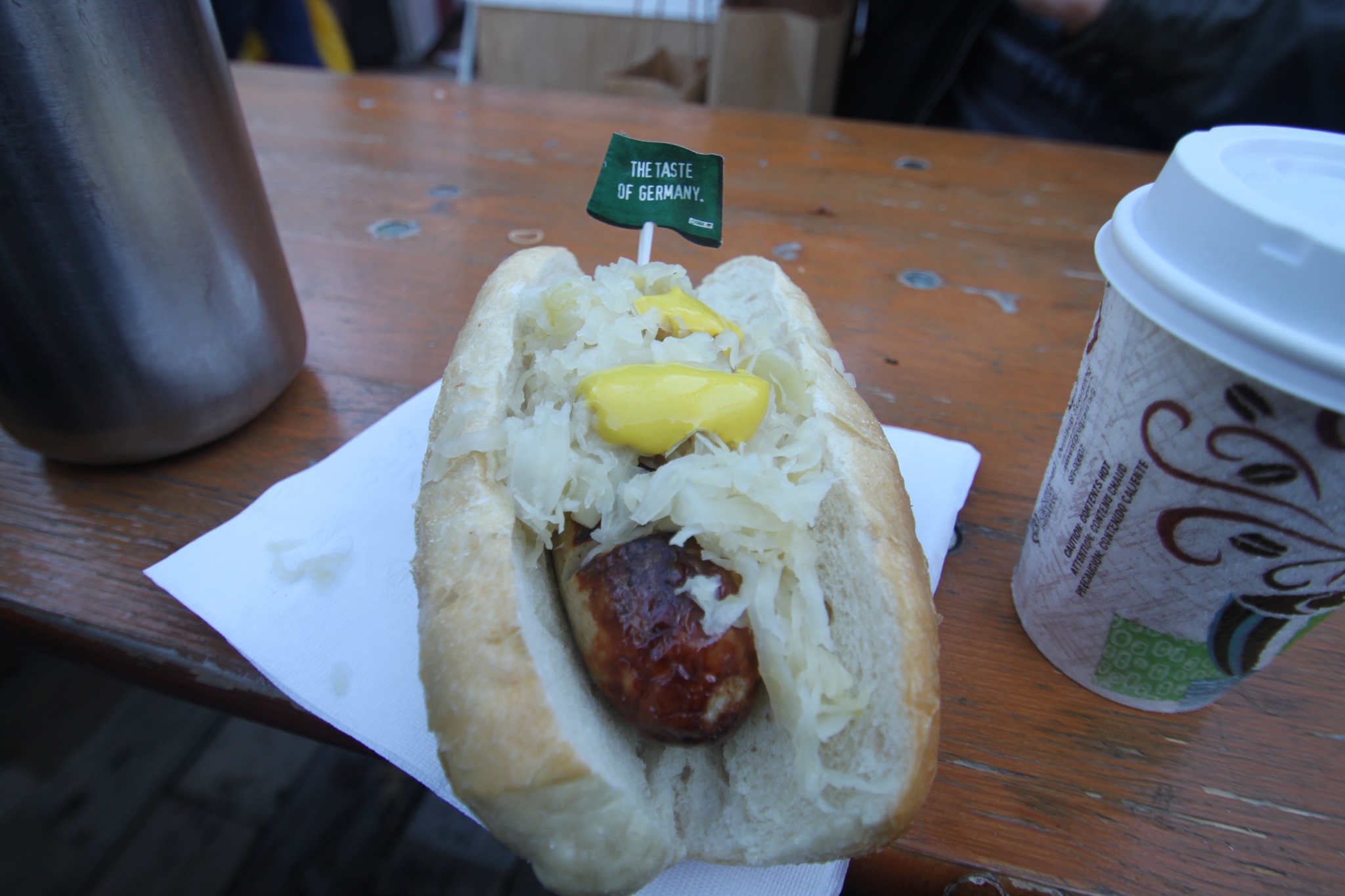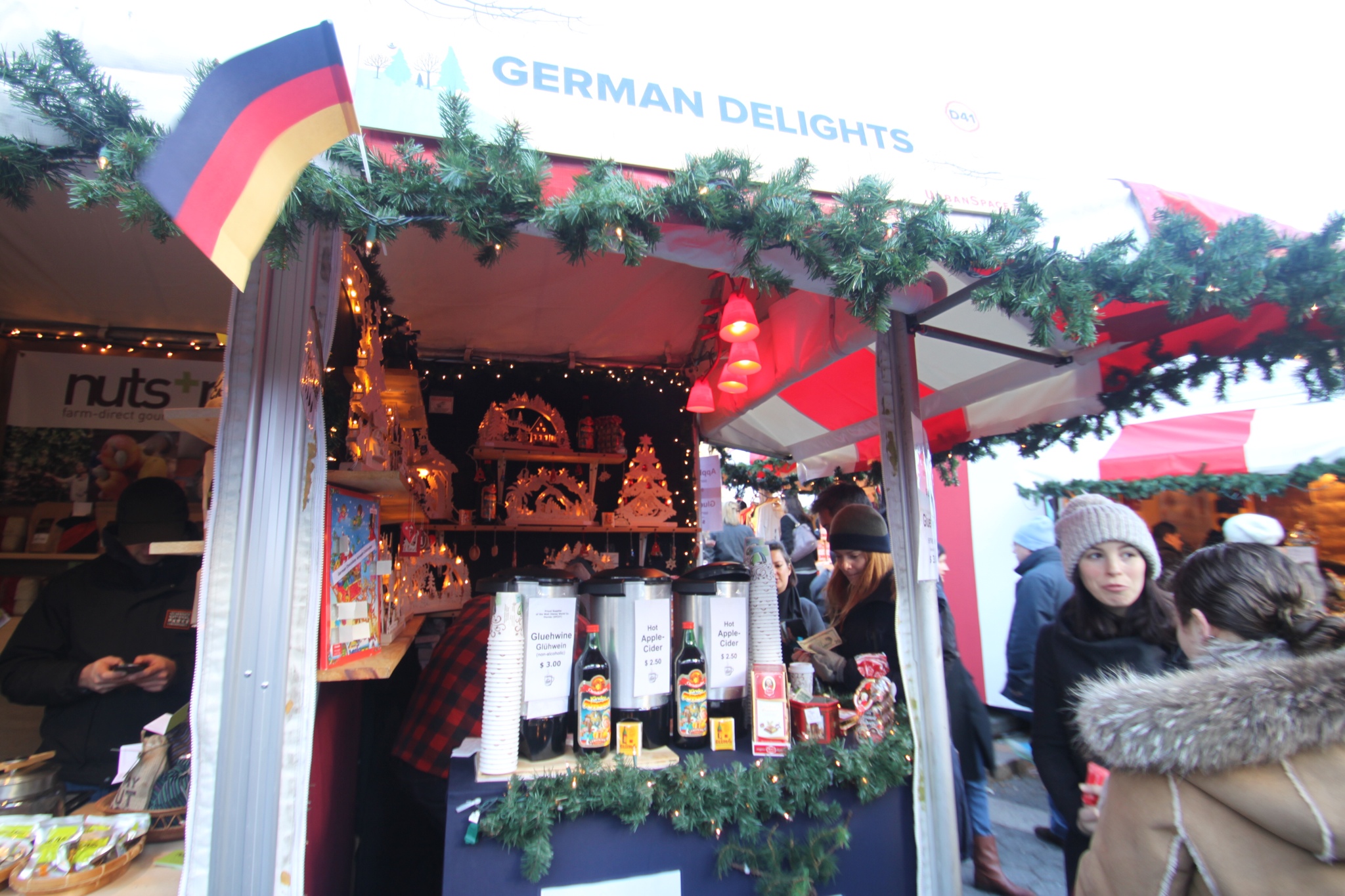 A short subway ride up to 59th street and one comes out onto Columbus Circle. After getting past the pedi-cab drivers who assume I'm a tourist (perhaps its the giant camera around my neck), I emerge into the delights of narrow alleyways lined with more vendors selling such varied items as homemade soaps, tibetan handcrafts, and microwavable pillow pets. The food stall section is much more delineated at the market at Columbus Circle, where one has the choice of Hong Kong Street Food, Korean BBQ, Domo Taco (nothing too Christmasy here folks), and then of course, the European favorites of apple cider, nutella crepes, and gourmet meatballs. Okay, maybe that's more of a hipster European favorite. But what Christmas market would be complete wtihout a German Delights food stall selling the invenerable German Bratwurst sandwhich to be washed down with Gluewhine (warm spiced-wine).