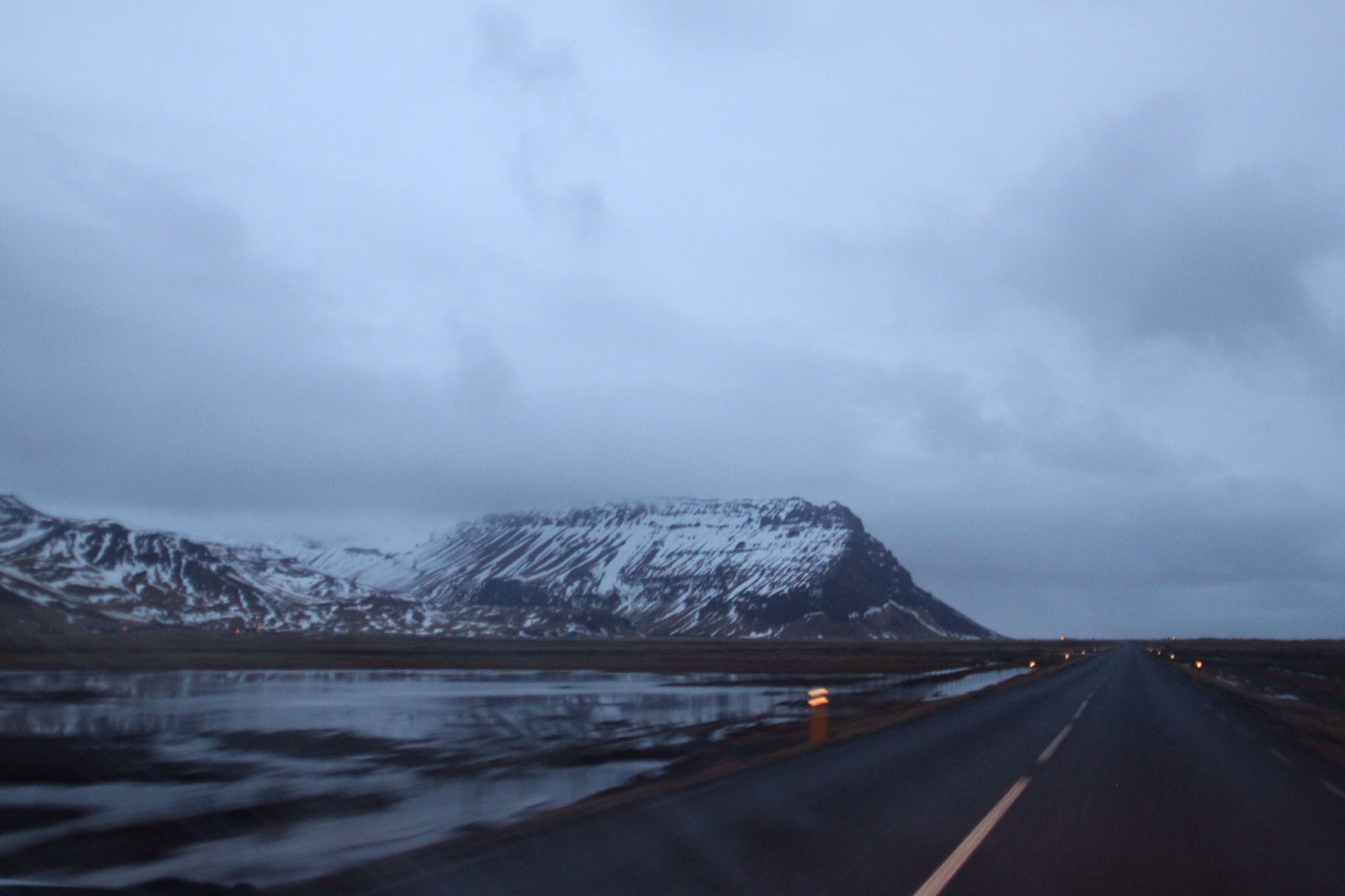 Yesterday, we drove about 3 hours into the Southeast of Iceland towards the Solheimajokull Glacier. We had booked a glacier hiking tour and were instructed to meet at the parking lot by 12pm. We left a litte early so we would get a chance to stop off at the nearby waterfall in Skogar, just the sun came up. Driving through Iceland while still dark, it felt like it was 4 in the morning, when in reality it was 10am. As dark slowly turned to light, we could start to make out some of the volcanic, snow covered mountains around us.