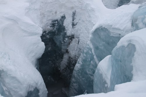 Eventually, we made our way up to the glacier and were able to walk on the ice with our crampons. Thirstin pointed out ice cracks, crevasses, canyonne, ash mounds, and even a giant hole.