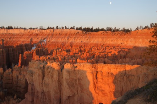 There are few sights in this world more glorious than watching the sunrise over Bryce Canyon. After a long day of hiking the day before, we had planned for an early start to catch the sunrise, leave Bryce, then spend a good portion of the day driving straight across the state via route 12; one of America's great scenic byways. We awoke early (as usual), bundled up with hats and jackets, walked out the front door of the lodge, and headed through the dark, guided by our headlamps, to Sunset Point. Though all the guidebooks advise to head to Sunrise Point for the sunrise (duh), we took the advice of the good ranger who did not lead us astray in any of his previous suggestions (hiking trails, dinner, etc.). With very few other people joining us at this overlook, we knew we had made the right choice. We stood there quietly and reflectively, Michelle practicing her Yoga, as the bright, yellow beams of the sun began to peak up over the horizon and begin a glorious show of lights upon the red rock hoodoos that fill the ampitheater below.