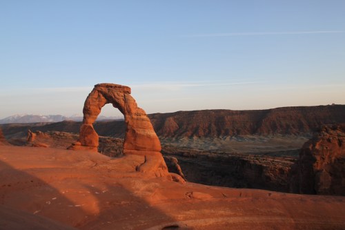 After getting our fill of Kitsch, we headed back up to Arches, to hike the trailhead up to Delicate Arch for sunset. After climbing up a rather steep rock scramble, and hiking our way around a carved out cliff in the rock, we turned the corner to come upon one of the most resplendent sights I have ever seen. Delicate Arch at sunset cannot be overexaggerated, and while there were quite a few others there with us up on that ledge of rock, it still felt like a peaceful and serene moment of solitude.
