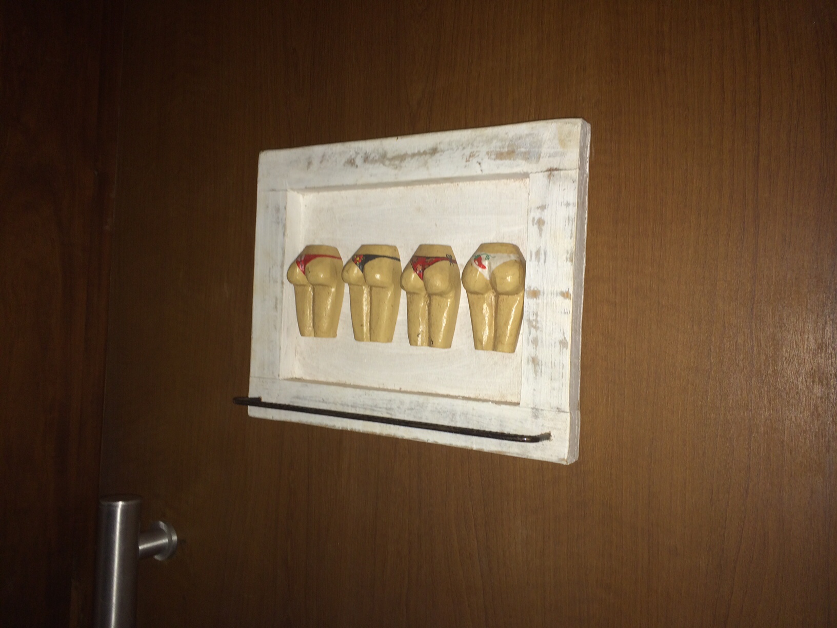 And just in case your find yourself at the restuarant some time in the future and can't figure out where the bathroom is, just look for these symbols on each door; the banannas indicate men, and the bikinis, women.