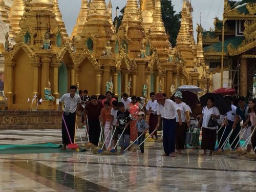 From here, we headed to the Bogyoke Market to grab some lunch, and perhaps do some early souvenir shopping. After eating a questionable meal (still not sure if we’re in the clear from this one) of cold chicken curry and a Burmese version of vegetable samosas, we went back into the market where we stumbled upon a bunch of people cheering in a circle, and a friendly man explained to us that it was a game which would be on national television. As the weather looked like it was clearing up a bit (how quicly our definition of good weather has changed), we hopped a cab to take us to the iconic Shwedagon Pagoda.