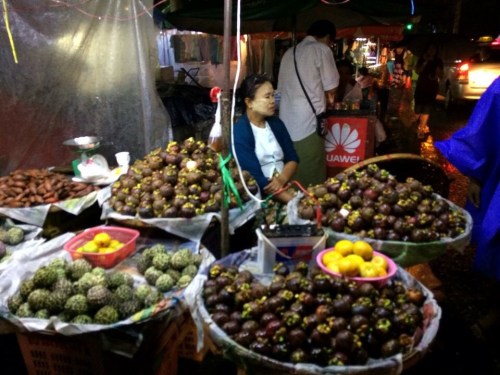 As the weather continued to worsen (didn’t think it was possible) we headed back to the hotel for some pre-dinner wine, then made our way to 19th street; the famous night market of Yangon. All along the road there are bars and restuarants, many of which pour out into the street offering “pick your own” mystery things on a stick, that are then taken away and presumably bbq’d for you. After filling up a basket with weird looking balls, vegetables, and something that resembled a baby bird, we ordered two giant Myanmar beers and were given a small plastic table to sit at, and awaited our feast of grilled “what the hell are we eating?”.