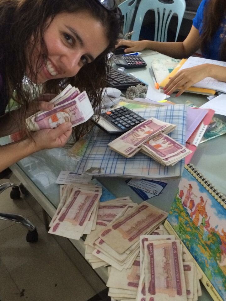 After breakfast, where I tried Mohinga (Myanmar’s favorite breakfast of catfish soup), we ventured out into the Monsoon to find a local tourism agent to book our domestic flights for the remainder of the trip. After about 2 hours of smiling politely back and forth to each other, the agent finally showed us our flights and asked us to pay…one slight problem, they do not accept credit cards. In fact, credit cards are pretty much non-existent in Myanmar, but they do accept U.S. dollars, particularly brand new, crispy U.S. dollars- actually worth more in an exchange. Hmm, perhaps I should have read the guide book before arriving here. With not enough cash on either of us, Michelle and I worked our way to multiple ATMS and a money exchanger, in order to scrounge together enough cash between the two of us to pay for the flights. Being that we had to pay over $700 US dollars in what would be the equivalent of $5 bills, this process alone took another hour.