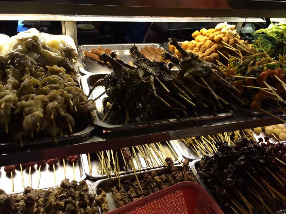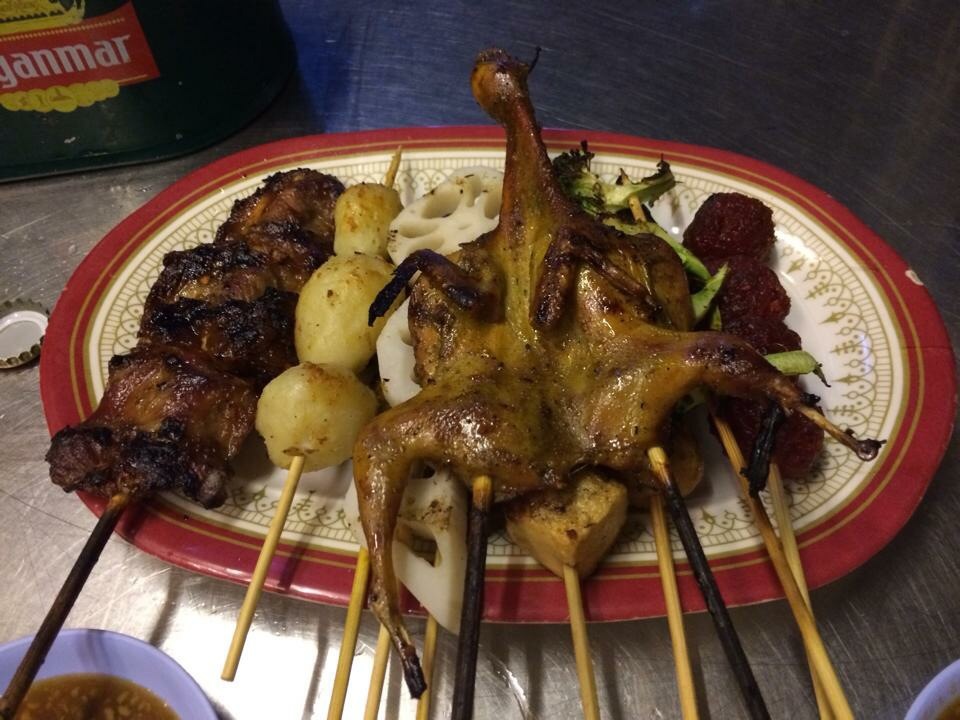 As the weather continued to worsen (didn’t think it was possible) we headed back to the hotel for some pre-dinner wine, then made our way to 19th street; the famous night market of Yangon. All along the road there are bars and restuarants, many of which pour out into the street offering “pick your own” mystery things on a stick, that are then taken away and presumably bbq’d for you. After filling up a basket with weird looking balls, vegetables, and something that resembled a baby bird, we ordered two giant Myanmar beers and were given a small plastic table to sit at, and awaited our feast of grilled “what the hell are we eating?”.