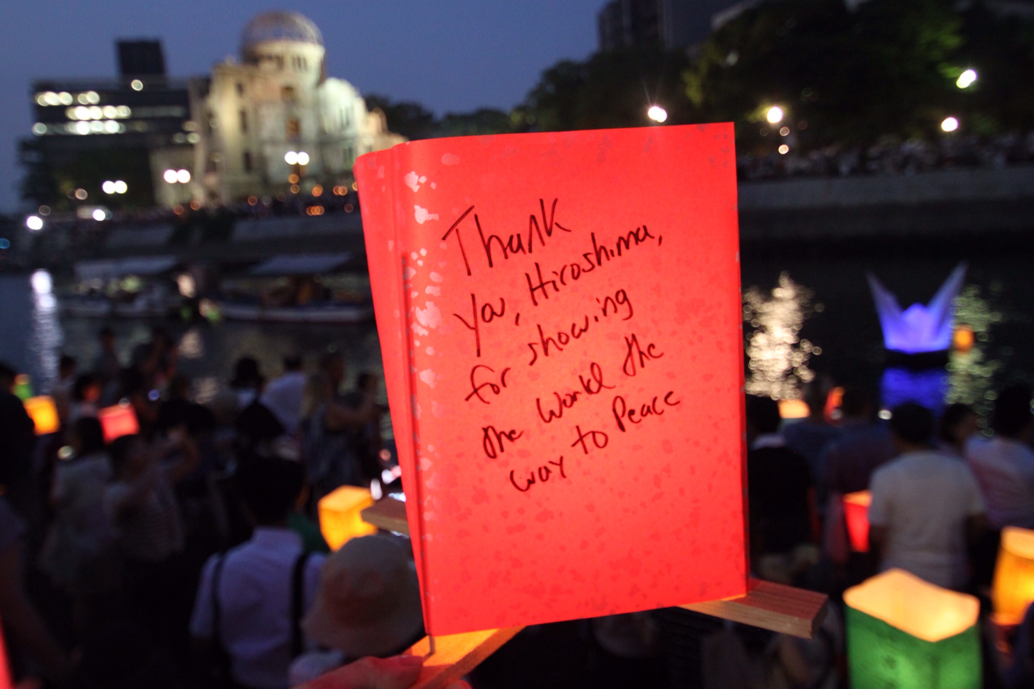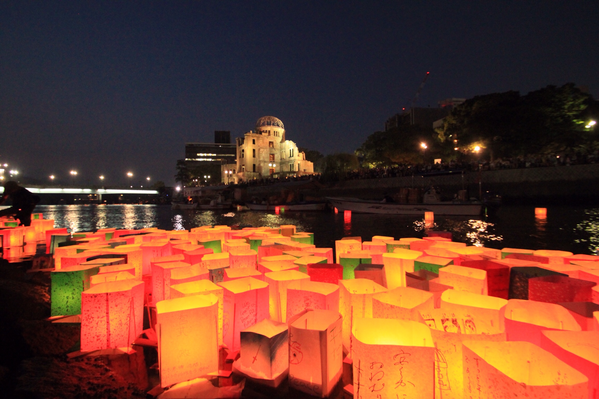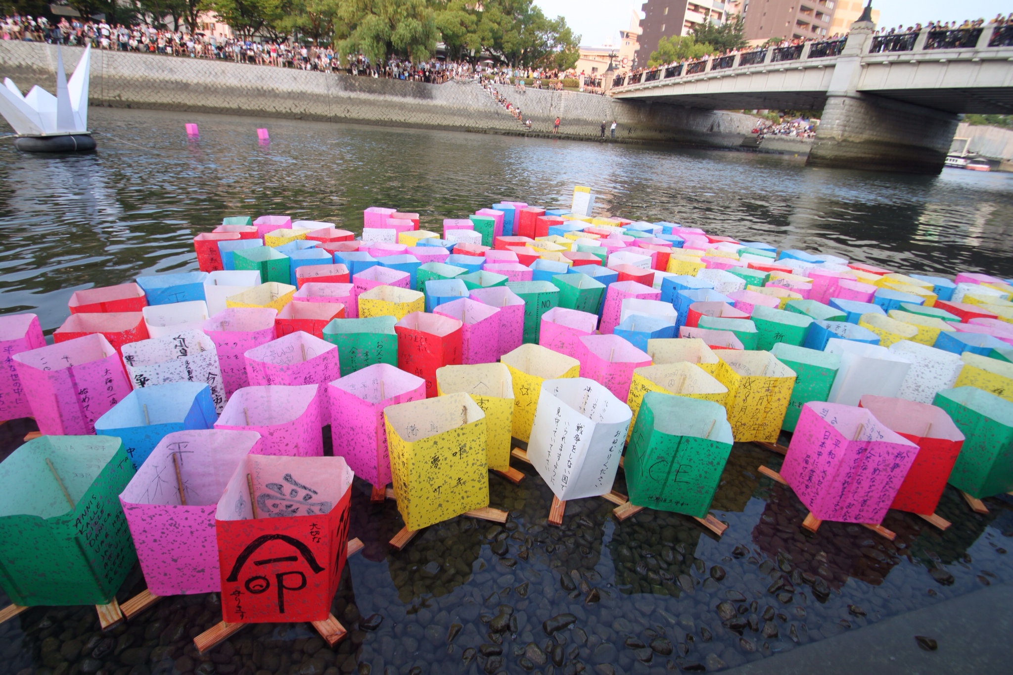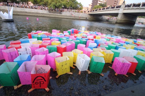 On the anniversary of the bombing each year, the city of Hiroshima hosts a paper lantern ceremony, where individuals can write a message of peace on colored paper, then that evening, bring it to the waterfront where they are given a wooden frame to wrap their message around, and send it down the river.