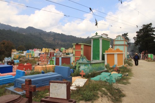 From here, we asked our guide if we could visit the cemetary, as I had read that one should not attempt to visit it without a guide. We walked up a large hill where there were numerous colorfol stones that overlooked the city. The cemetary is considered both Catholic and Mayan.