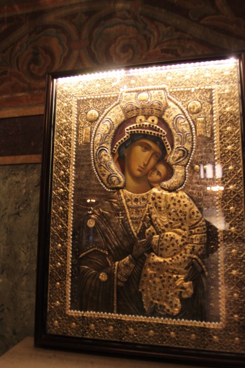 Just as we walked back into the town, those clouds began to open up and next thing I knew, a woman from a balcony yelled at us to take shelter in the covered entrance of the church. The church appeared closed, but we stood underneath its front awning, outside the entrance deciding what would be our plan of attack to make it either to a restuarant to eat or back to the hotel without getting soaked. After about 10 minutes, the front door opened and out came two men; an orthodox priest and the church’s caretaker. Once the priest existed the church, the caretaker invited us in to get out of the rain and asked us if we liked music to which we replied yes. He motioned for us to sit down on the wooden pews that sit along the side of the church and went behind the iconoclastic altar to turn on the music as we found ourselves starring upwards at the beutifiul orthodox frescos on the ceiling listening to the enchanting hymns of monks echo throughout the church with the rain falling down outside. We sat there for what seemed like an eternity before we heard a reprieve in the rain and decided to take our leave from the church.
