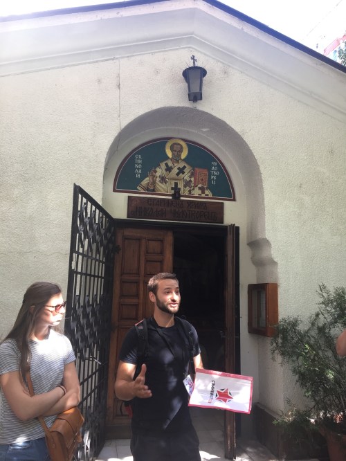 Next we stopped off at a small, very basic white church in down a not so busy road. Danielle explained that after World War II, the Communists decided to rebuild the churches, which had been bombed out by the Allies, in an effort to not make it so prohibited, that way people wouldn’t resist. During the years of communism, people were afraid to go tot church because there would be secret police there who would put people’s names on a list which could prevent them from going to university, which consequently, could damage thier entire life. Also, during big religious celebrations like Easter and Christmas, the government would play on television Oscar winning movies. This was likely the only time Bulgarians would be able to see these movies, so they would opt to stay home from church and watch them. The other thing the communist party did was to hide temples so it would be hard for people to find them should they want to attend a service. Our guide pointed out one building with a cross on it, explaining there was a hidden church inside there. Across the street, behind 3 gigantic buildings, there was another church, barely noticeable. Essentially, the government didn’t want to banish and destroy the church out of fear of the forbidden fruit factor, so rather, they made it quite difficult and less appealing to attend.